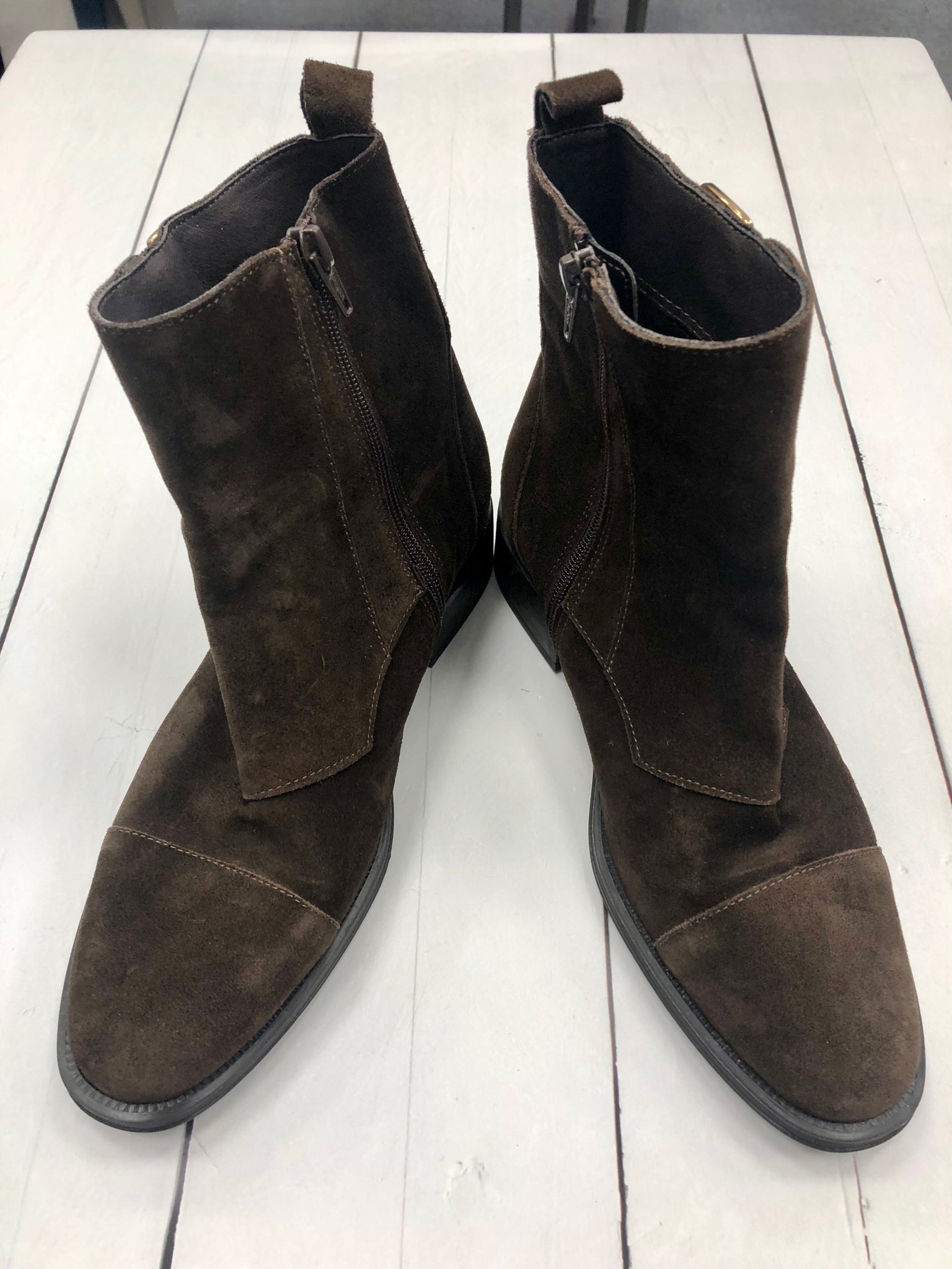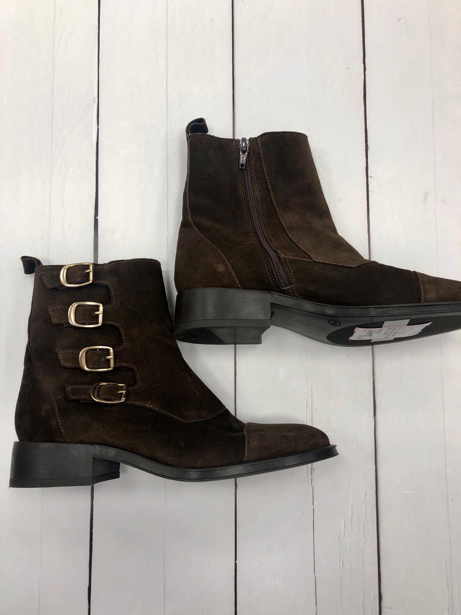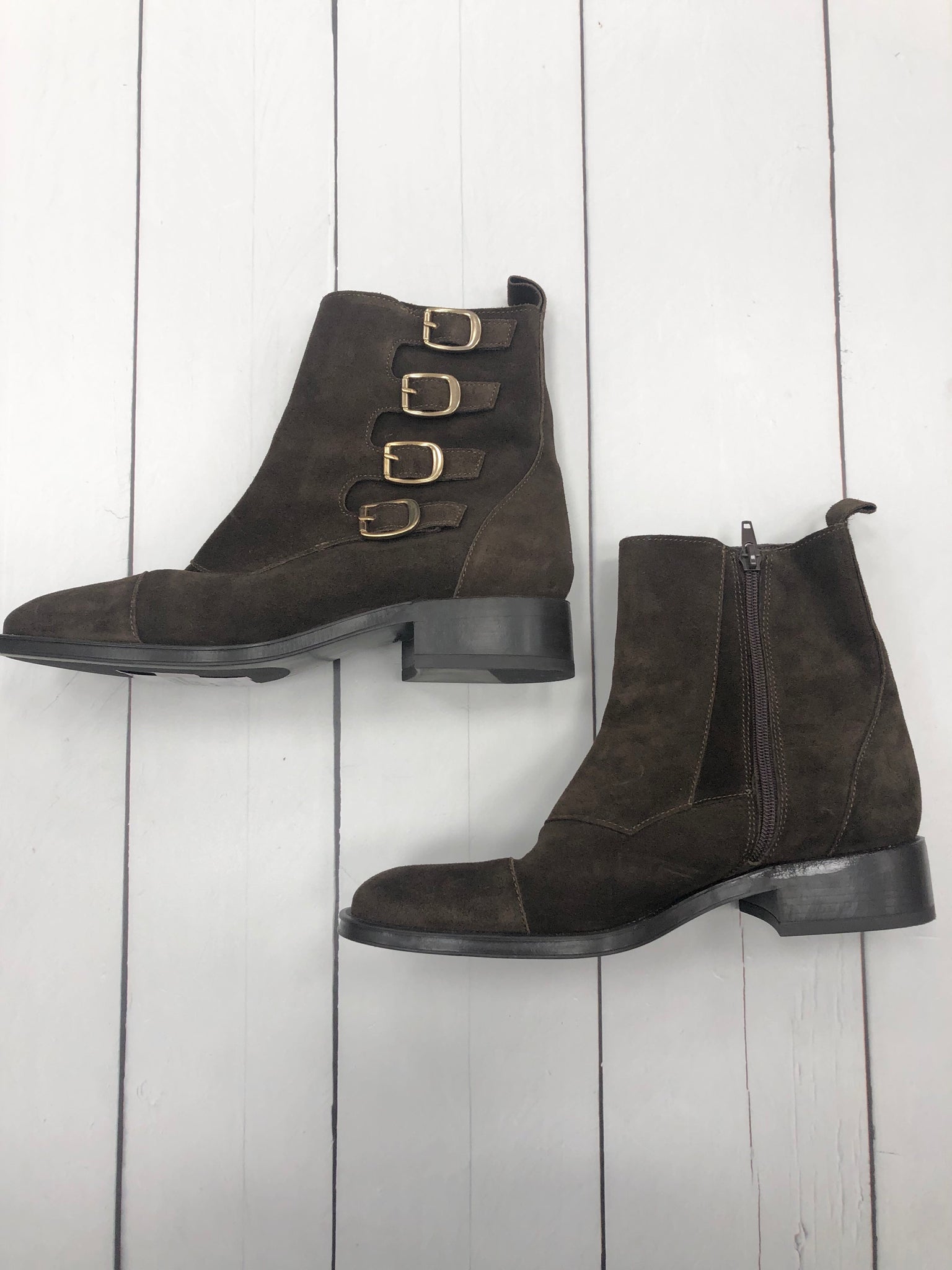 Brown suede boots w/gold buckle and side zip (US size 8)